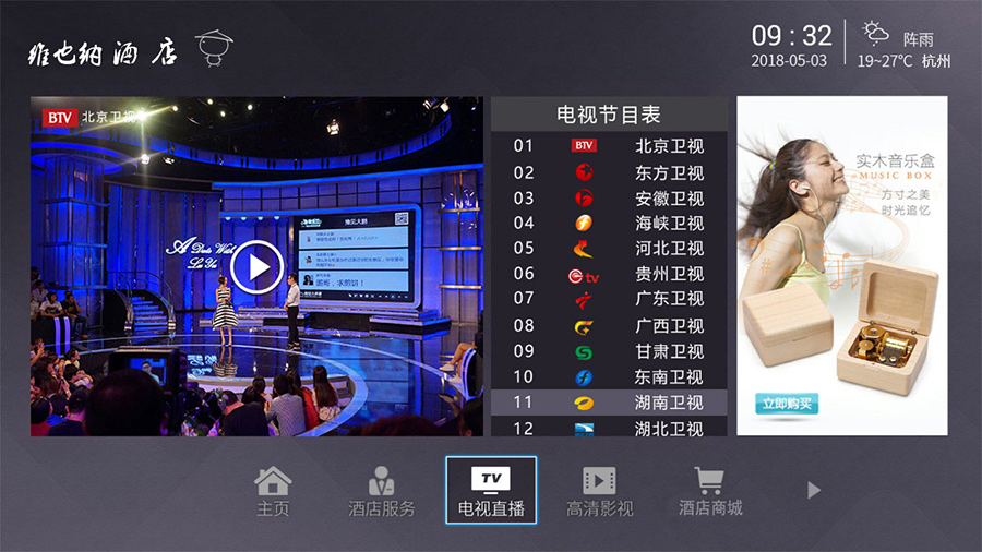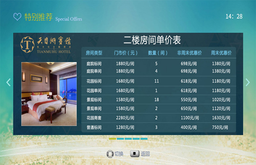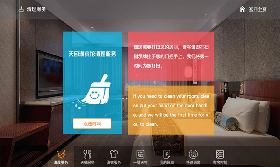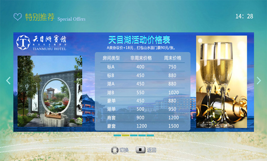 主界面背景为酒店宣传视频、酒店特色尽收眼底,通过后台自由更换内容