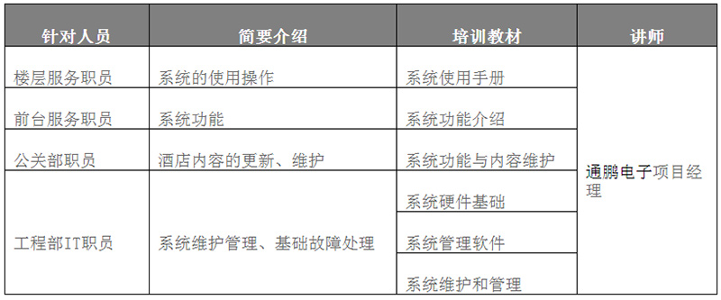 项目实施团队将为酒店相关人员进行系统的使用培训,提供培训教材,分别对酒店前台人员、楼层服务员、公关部、宴会或会展部人员、电脑部技术人员进行电视系统()的使用与操作培训。