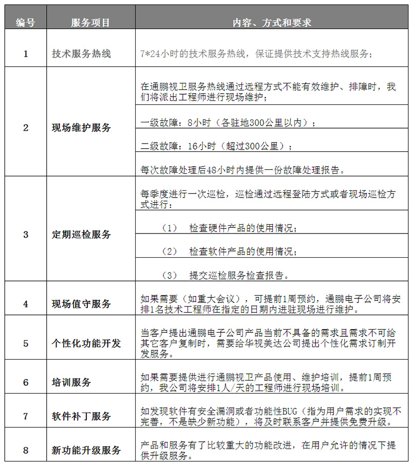 通鹏视卫科技公司产品售后服务专线为核心的7*24小时售后维护响应体系,产品均实行一年免费保修。免费保修期后提供有偿的系统维护、部件更换、软件升级服务。通鹏视卫的售后服务体系遍布全国20余个省份暨直辖市,提供本地化支持,能够为酒店提供强大的技术保障。