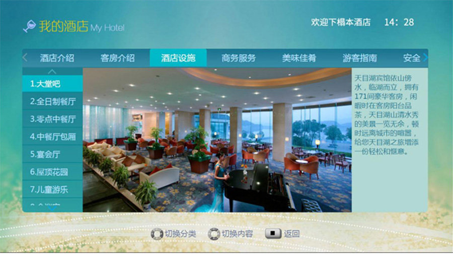 酒店通过多媒体系统向客人全方位展示酒店大堂、客房会议室、商务中心、运动吧、行政酒廊等内容。
