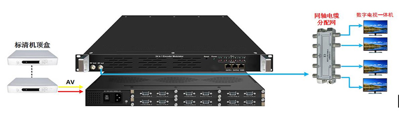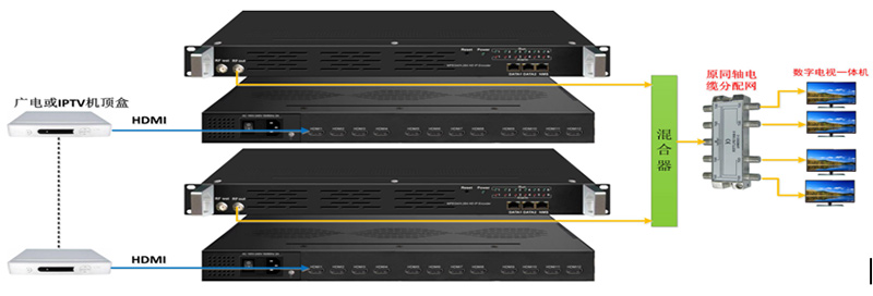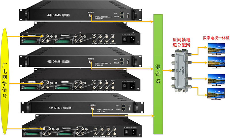 采用2-4台设备接收广电有线网络信号,每台调制器可从8个有线频点中选择节目再解扰。复用后国标调制输出,终端无需机顶盒。设备支持IPTV节目输入功能。