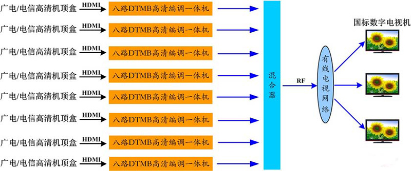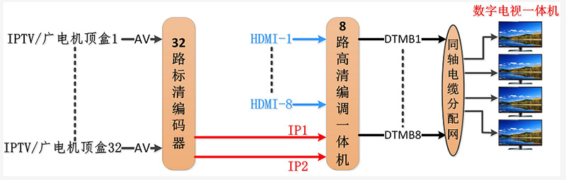 系统描述:采用32路标清编码器接入32套节目的音视频进行编码,然后IP送入八路高清编码调制一体机进行复用,转换为8个DTMB载波射频输出,通过同轴电缆传输到各个终端。本方案信号源容易取得,稳定性好。整个系统传输40套高标清节目,性价比高。