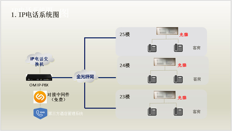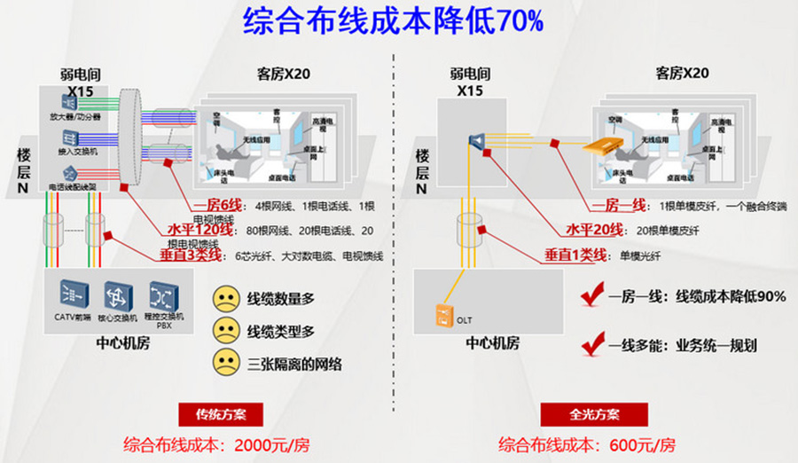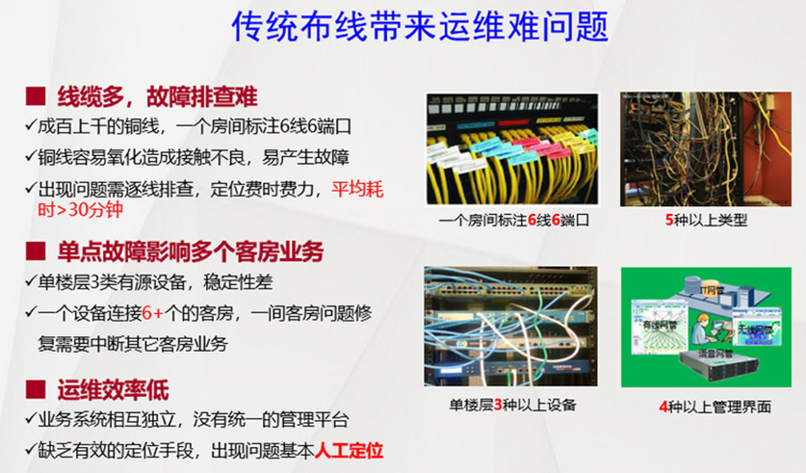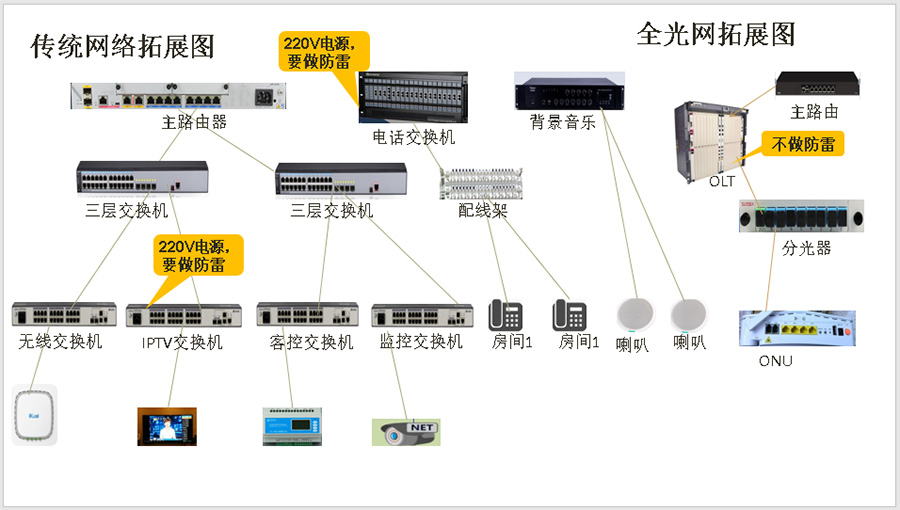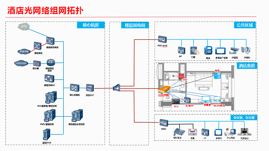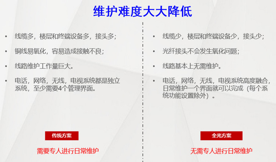 基于全光网络传输,提高系统的安全性与可靠,在酒店网建设中,安全性是整个网络建设中的重中之重,同时系统本身具有高度的可靠性,保证酒店不同业务的正常运行。全光网络提供简单易用的综合网络管理系统,通过全网的管理软件,实现网络的简易便捷运维,减少日常维护费用。全光网络承载多种业务,提高可扩展性、多业务覆盖、个性化定制需求,增强客户体验,提高酒店品牌形象。