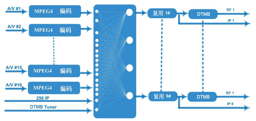 DX3526SA  16路标清编码调制一体机是我公司*研发的高集成度的标清编码调制设备。该设备支持16路CVBS输入(复合视频和非平衡立体声音频)、1路DTMB输入、支持MPEG-4 AVC/H.264编码,节目复用成8路MPTS输出。支持1个百兆/千兆IP输入/输出口。该设备支持OSD功能,可在每路编码视频中插入图片、二维码、文字等信息,具有高集成度、高性能、低成本的特点,单台设备集成了一套前端系统功能,非常适用于酒店、会所、医院、浴场等IPTV电视系统。