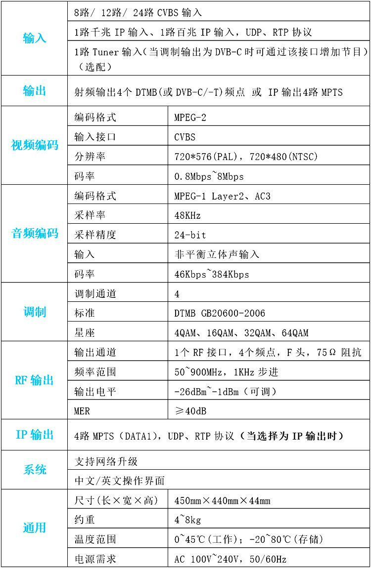 ♦ 支持8路、12路、24路CVBS输入,支持1路千兆IP输入、1路百兆IP输入,128个IP地址,UDP/RTP协议
