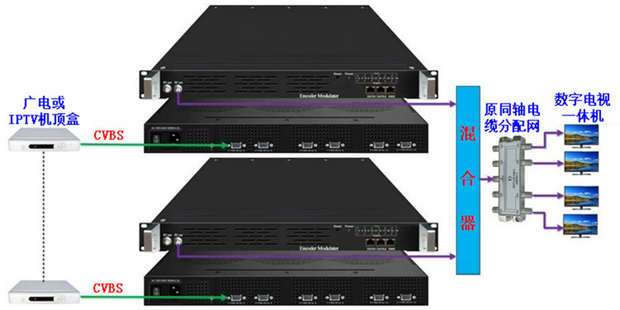 12路标清编调一体机是我公司*研发的集编码和调制于一体的高性价比图文编调设备。该设备支持OSD功能,可在每路编码视频中插入图片、二维码、文字等信息,具有高集成度、高性能、低成本的特点,单台设备集成了一套前端系统功能,非常适用于酒店、会所、医院、浴场等IPTV数字电视系统。