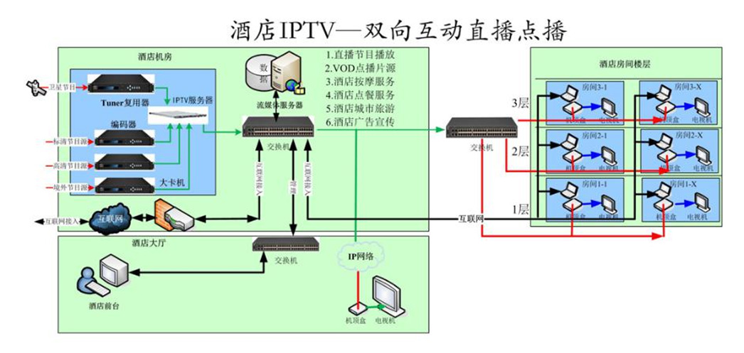用户将从直观且又友好的用户界面得到极大的用户体验。用户界面提供了用户所有可用的内容和详细信息,更好的支持用户来挑选其感兴趣的内容进行观看,并且支持点播、暂停、重放以及快进等功能操作,房间用户可以随时随地的进行观看直播电视和点播视频内容,以及体验其他电视业务。下面将描述 IPTV 解决方案的总体架构。