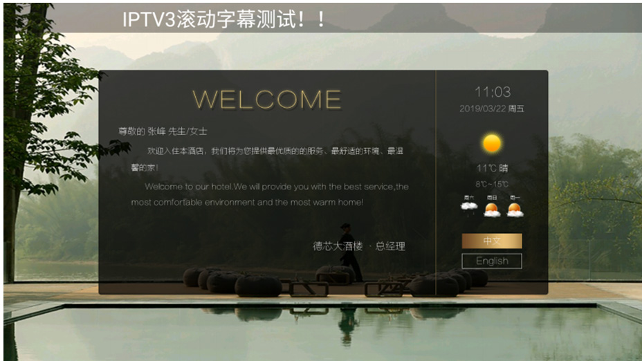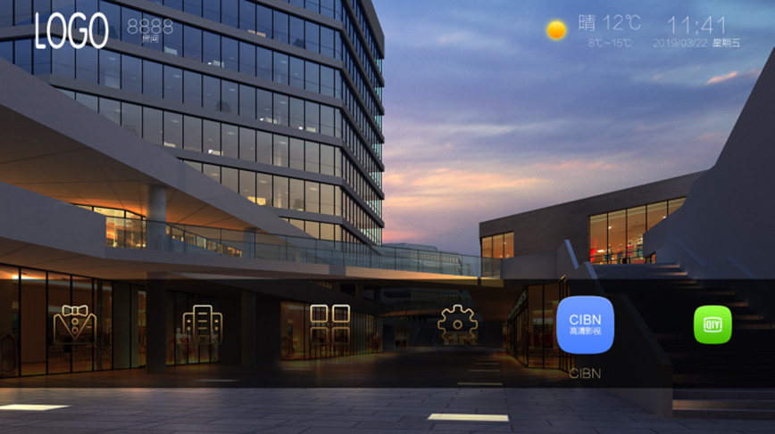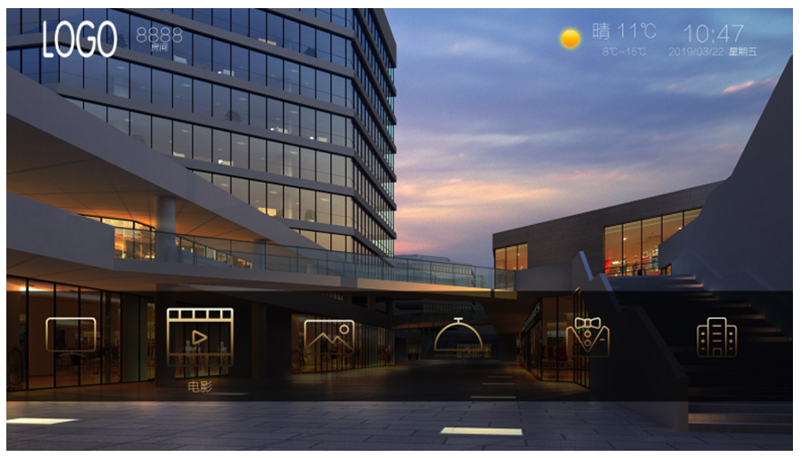 开机欢迎界面实现语言选择,背景可为宣传图片或宣传视频,展示天气信息等;