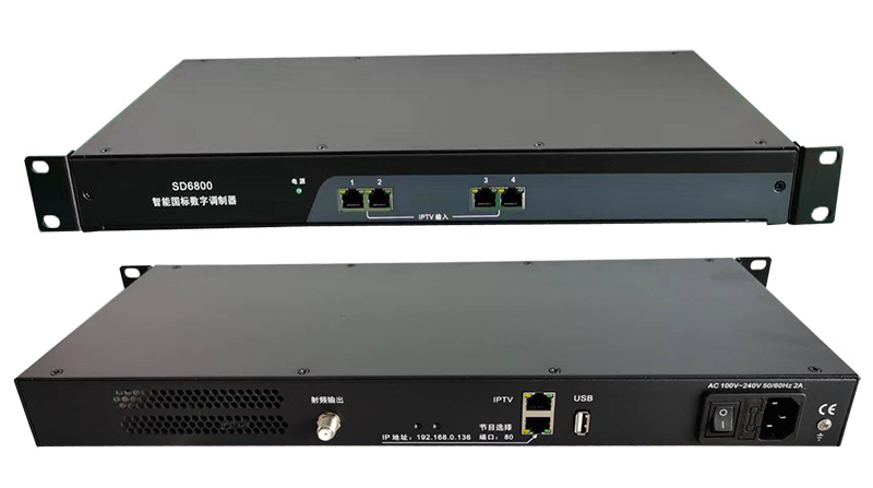 智能IP转DTMB调制器是我公司专为医院、学校、酒店等场所解决数字电视信号源而*研发的具备高性能、高性价比的IP转 DTMB国标调制器。该设备前面板由4个百兆网口组成,4个网口均为IPTV输入;后面板由1个射频口、2个IP口和一个USB接口组成,射频口支持4个DTMB单载波输出,USB口可以播放自办节目,2个网口分别为1路百兆/千兆自适应IPTV输出(也可做节目选择)和网管口(联网可以远程管理+选择节目)。该设备具有高性能、低成本的特点,非常适合各种营业性场所自办节目和远程管理(如:学校、酒店、会所、茶楼等)数字电视前端系统使用。