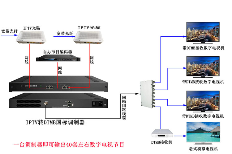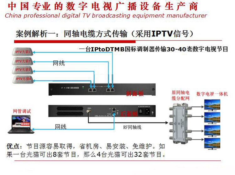 选择使用电信/联通/移动iptv信号源,只要开通1-5条宽带光猫就可以输出几十套DTMB的国标信号,解决以前模拟信号的模糊、雪花、不清晰等问题。