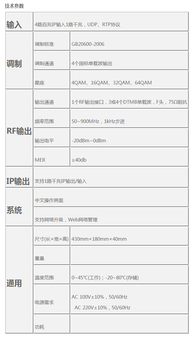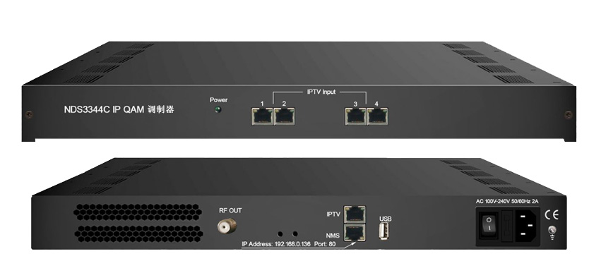 5网口IP DTMB调制器是我公司专为营业性场所解决数字电视信号源而*研发的具备高性能、高性价比的IP转 DTMB国标调制器。该设备前面板由4个百兆网口+1个千兆口组成,5个网口均为IPTV输入;后面板由1个射频口、2个IP口和一个USB接口组成,USB口支持做自办节目,射频口支持4个DTMB单载波输出,2个网口分别为1路百兆/千兆自适应IPTV输出和网管口(主要作用选择节目)。该设备具有高性能、低成本的特点,非常适合各种营业性场所(如:酒店、会所、茶楼等)数字电视前端系统使用。